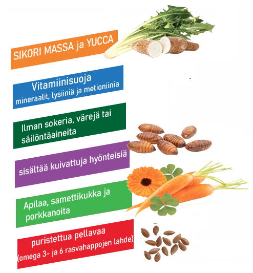 - Yucca schidigera: pahojen hajujen torjuntaan ja hyvään ruoansulatukseen.